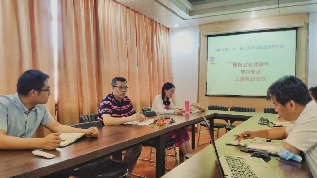为落实公司《关于开展第九届“廉政文化建设月”活动的通知》要求,大力弘扬廉政文化,增强党员干部法治思维和规矩意识,7月2日下午,beat365亚洲体育官方网站、泰中国际橡胶公司直属党支部举行廉政文化建设月主题党日活动。党支部书记张树海主持活动,并为党员同志们做了廉政专题党课。